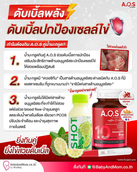 A.O.S By KruKoy ผลิตภัณฑ์เสริมอาหารที่ออกแบบมาเพื่อผู้หญิงที่มีภาวะมีบุตรยาก เนื่องจากเซลล์ไข่ที่ไม่มีคุณภาพ ไข่ไม่สมบูรณ์ จากการถูกทำลายของอนุมูลอิสระ ด้วย 10 สารสกัดของสารต้านอนุมูลอิสระที่มีประสิทธิภาพ พร้อมทั้งมีงานวิจัยรองรับว่าอาจมีส่วนช่วยให้สามารถช่วยเพิ่มคุณภาพของเซลล์ไข่ ให้พร้อมสำหรับการปฏิสนธิ