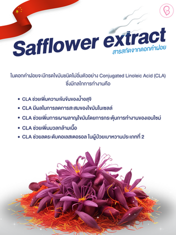 ( 12 ) Safflower extract หรือสารสกัดจากดอกคำฝอย มีกรดไขมันชนิดไม่อิ่มตัวอย่าง Conjugated Linoleic Acid (CLA) ที่อาจมีส่วนช่วยลดการสะสมไขมัน เพิ่มการเผาผลาญไขมัน ในผู้ชายที่มีภาวะอ้วน ซึ่งเป็นสาเหตุหนึ่งที่ส่งผลต่อคุณภาพของสเปิร์ม และยังมีการศึกษาวิจัยอีกว่า CLA ในดอกคำฝอยอาจมีส่วนช่วยเพิ่มความเข้มข้นของน้ำอสุจิ และลดระดับ ROS ที่ส่งผลต่อระดับคุณภาพของน้ำอสุจิค่ะ