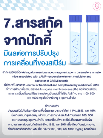 ( 9 ) Astragalus Extract หรือสารสกัดจากปักคี้ อุดมไปด้วยสารต่าง ๆ เช่น โคลีน ฟลาวานอยด์ กรดอะมิโน และกาบา ซึ่งมีงานวิจจัยกล่าวว่า สารสกัดจากปักคี้อาจมีส่วนช่วยให้จำนวนสเปิร์มเพิ่มขึ้น 84% และอาจมีส่วนช่วยให้การเคลื่อนที่ของสเปิร์มเพิ่มขึ้นจากเดิมถึง 101%