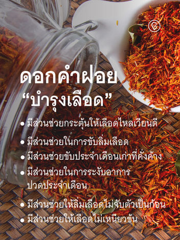 ใช้ชาดอกคําฝอยหนึ่งหยิบมือชงในน้ําร้อน ดื่มวันแรกที่มีประจําเดือนยาวไป 7-10 วัน อาจมีส่วนช่วยขับประจําเดือนดั่งค้าง บําบัดมดลูกให้สะอาด เลือดไหลเวียนไปเลี้ยงมดลูกได้ดีขึ้น ติดลูกง่าย