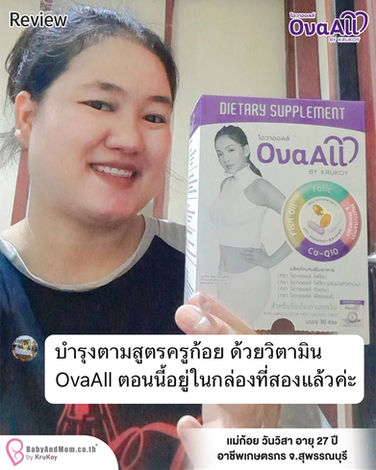 ของเซลล์ไข่ เพิ่มคุณภาพของตัวอ่อน อาจมีส่วนช่วยเพิ่มโอกาสฝังตัว และลดอัตราการแท้ง OvaAll เป็นวิตามินบํารุงไข่ที่ครบถ้วนที่สุด ถูก ออกแบบมาอย่างตรงจุด ให้บํารุงเข้มข้น สําหรับผู้หญิงที่มีบุตรยากโดยเฉพาะ ทั้งผู้หญิงที่เตรียมตัวปล่อยท้องธรรมชาติ รวมถึงผู้หญิงที่กําลังเข้าสู่กระบวนการ กระตุ้นไข่ เพื่อทํา IUI, IVF, ICSI (เด็กหลอดแก้ว)