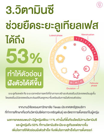 3. วิตามินซีอาจมีส่วนช่วยยืดระยะลูเทียลเฟส ซึ่งเป็นระยะหลังไข่ตก เป็นระยะที่ตัวอ่อนเข้าฝังตัว ซึ่งมีงานวิจัยของมหาวิทยาลัย Texas ประเทศสหรัฐอเมริกา ได้ศึกษาพบว่า ผู้หญิงเพียง 11% เท่านั้นที่ตั้งท้องโดยไม่ทานวิตามินซี และผู้หญิงถึง 53% ที่ทานวิตามินซีจะมีระยะลูเทียลเฟสยาวขึ้น อาจมีส่วนช่วยเพิ่มโอกาสให้ตัวอ่อนฝังตัวสำเร็จ จึงอาจมีส่วนช่วยให้เพิ่มโอกาสการตั้งครรภ์ได้ค่ะ