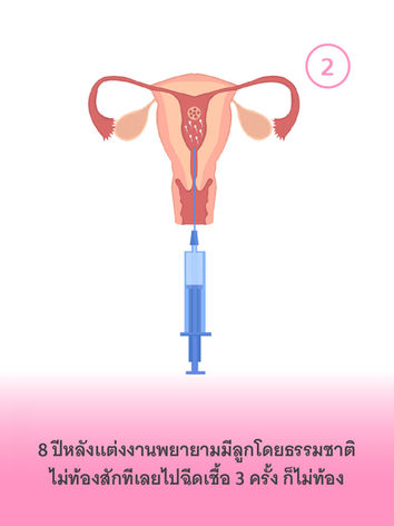 8 ปีหลังแต่งงานพยายามมีลูกโดยธรรมชาติ ไม่ท้องสักทีเลยไปฉีดเชื่อ 3 ครั้ง ก็ไม่ท้อง เลยตัดสินใจเข้าสู่กระบวนการทำเด็กหลอดแก้วเมื่อปี 2017 ตรวจเช็คทุกอย่างสรุปว่าสามีน้ำเชื่ออ่อนมาก ไม่สามารถมีลูกได้ตามธรรมชาติ จึงเริ่มต้นกระตุ้นไข่