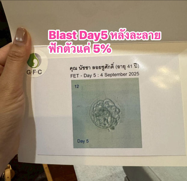 วันที่ 4 กย. 2568 เวลา 18:00 น. ย้ายตัวอ่อน No.12 (ฟรีซไว้เกือบ 5 ปี) เกรด BC เซลล์ 80% degenerate 5%